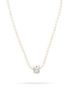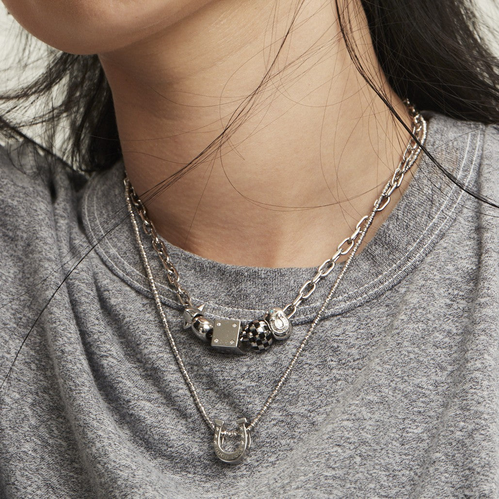 Sterling silver bead with baguette diamonds, round turquoise, and a ‘Good Luck’ engraving.