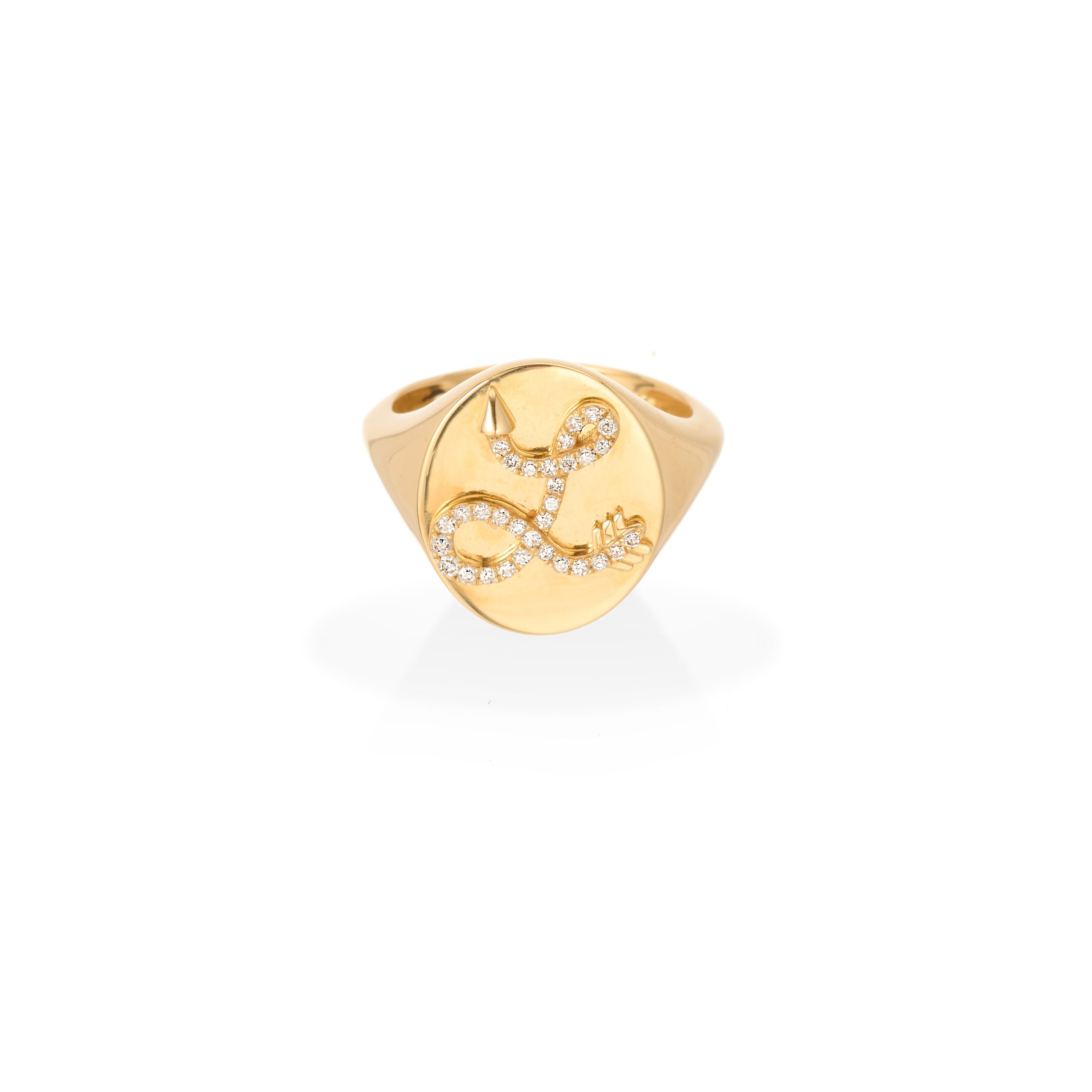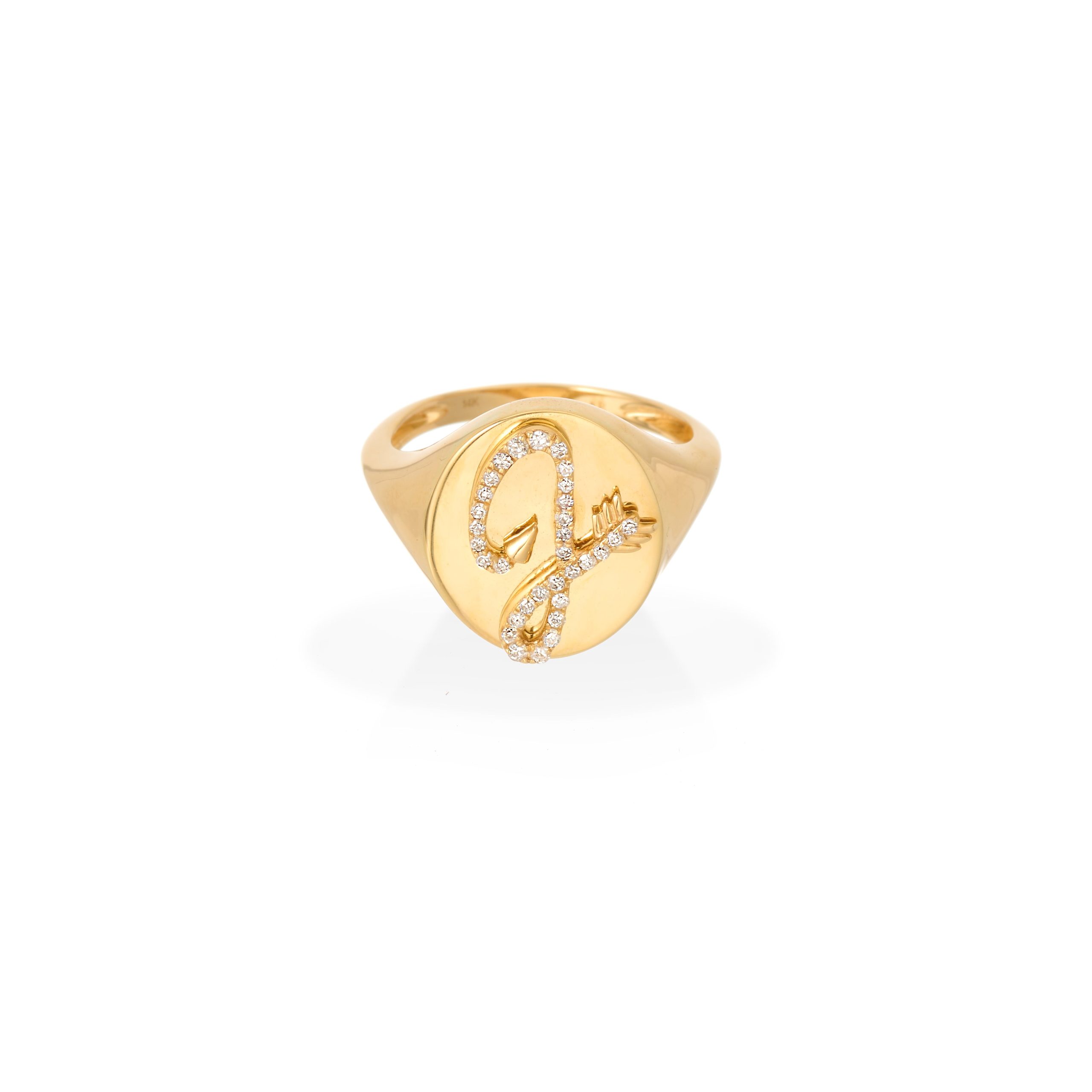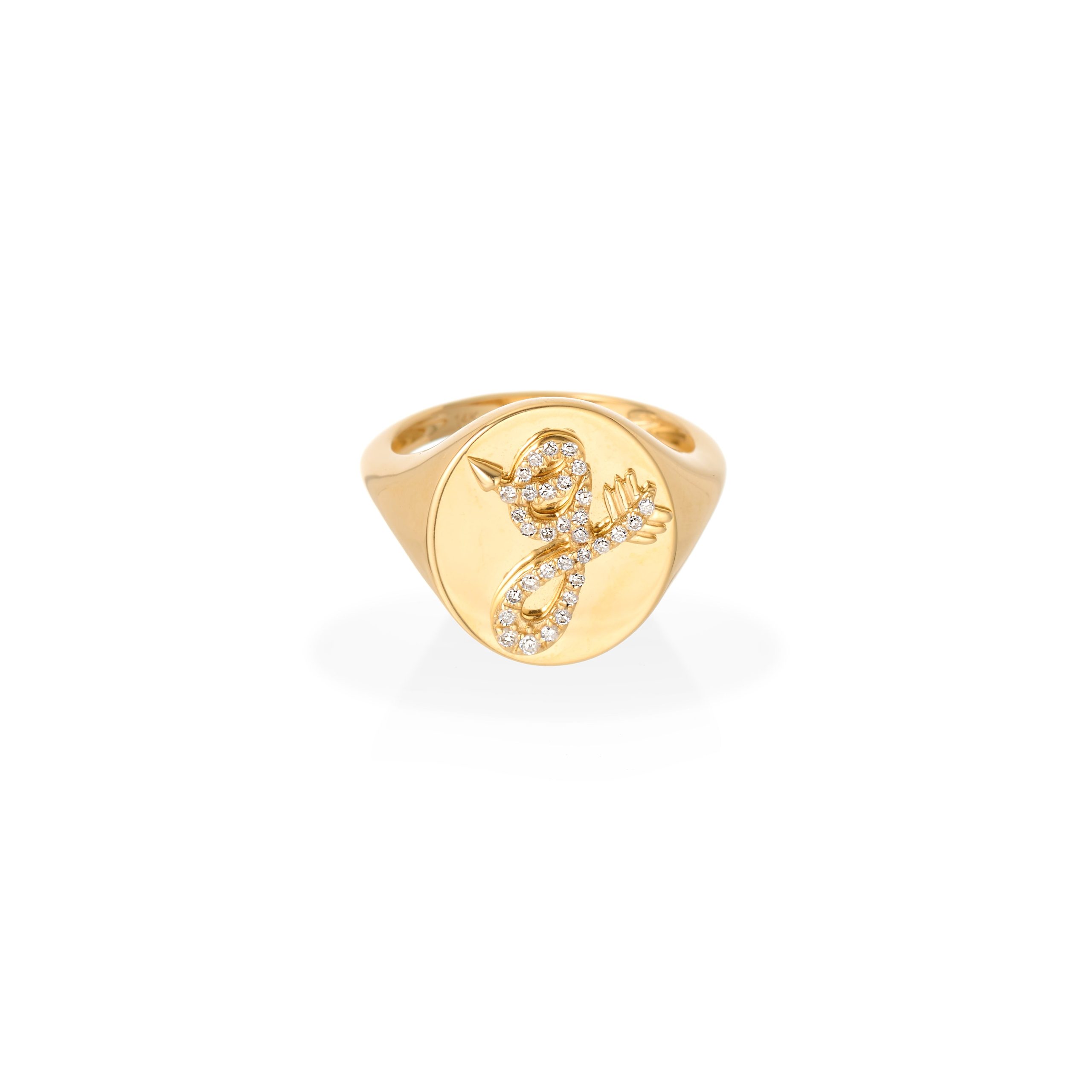 Handcrafted in solid 14k yellow gold, our Diamond Arrow Initial Signet Ring features your chosen initial wrapped in a pavé diamond arrow—symbolizing strength, movement, and protection. Inspired by our bestselling Diamond Arrow Initial Charms, this made-to-order ring (available in sizes 3–8) adds a refined personal touch to your everyday stack. We love it worn as a pinky ring or stacked with our Zodiac Signet Rings.