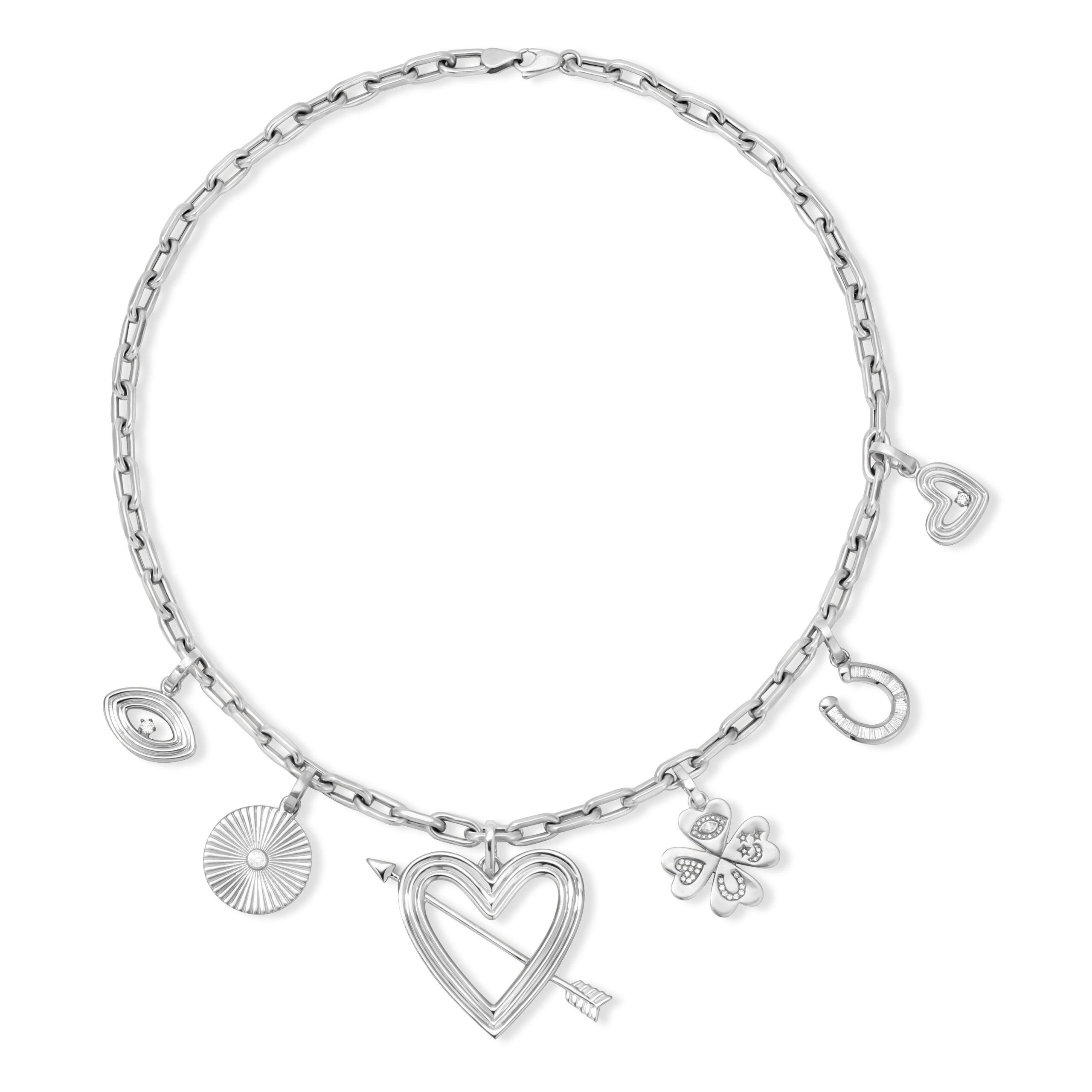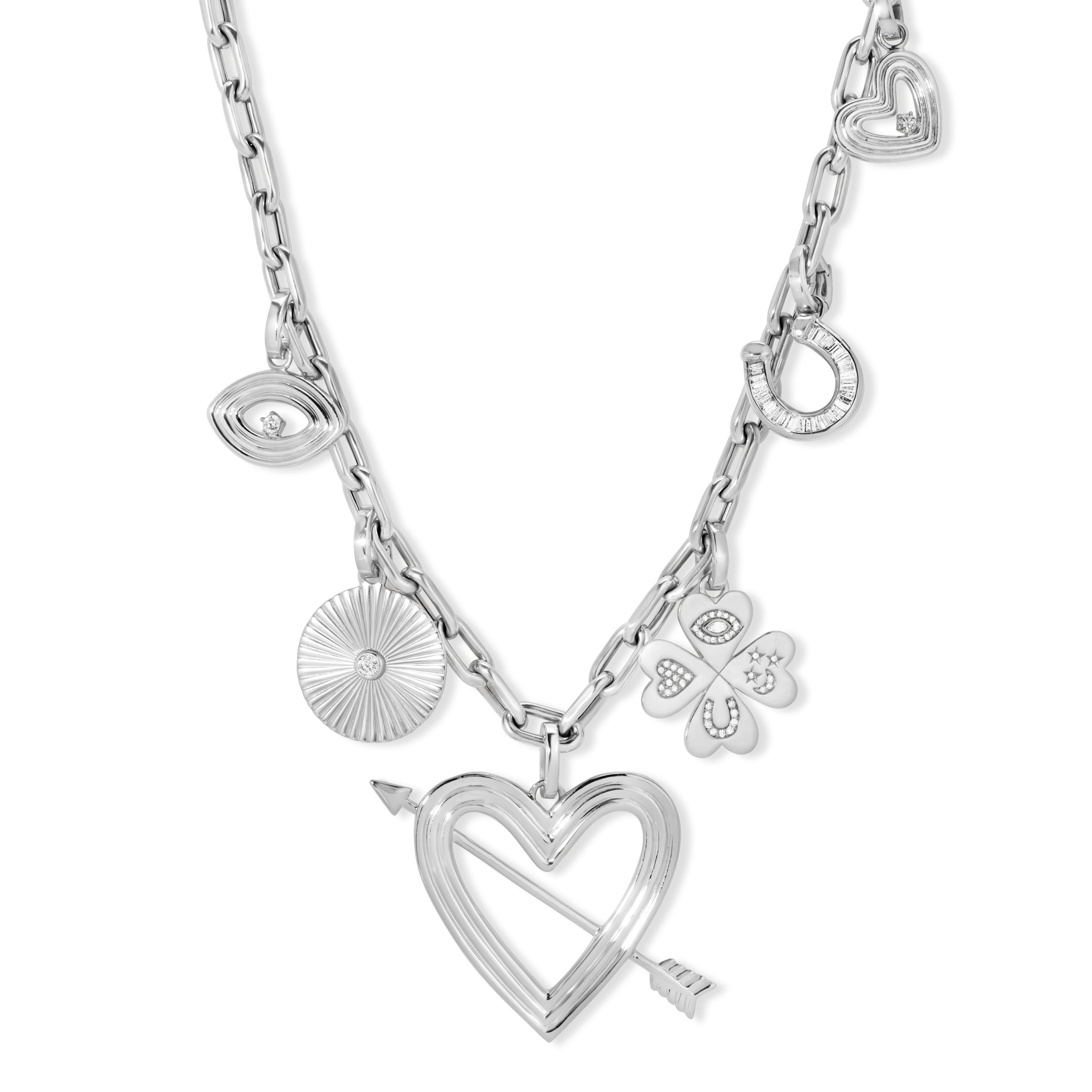Adina’s vision of the ultimate fine sterling silver Charm necklace comes to life in this bold Luxe Charm Necklace. Styled by Adina herself, this design layers our most beloved symbols of love and luck on our bestselling meticulously handcrafted 5.3mm Italian chain. The Groovy Heart + Arrow, Good Luck Clover, Baguette Horseshoe, Groovy Evil Eye, Groovy Diamond Heart, and Groovy Diamond Rays Charms are each handcrafted in fine sterling silver and set with brilliant diamonds. Every charm is hinged for effortless styling and arranged exactly as Adina would wear it. This is a statement in abundance and meaning, a piece that invites you to add your own favorites for a look that is uniquely yours.