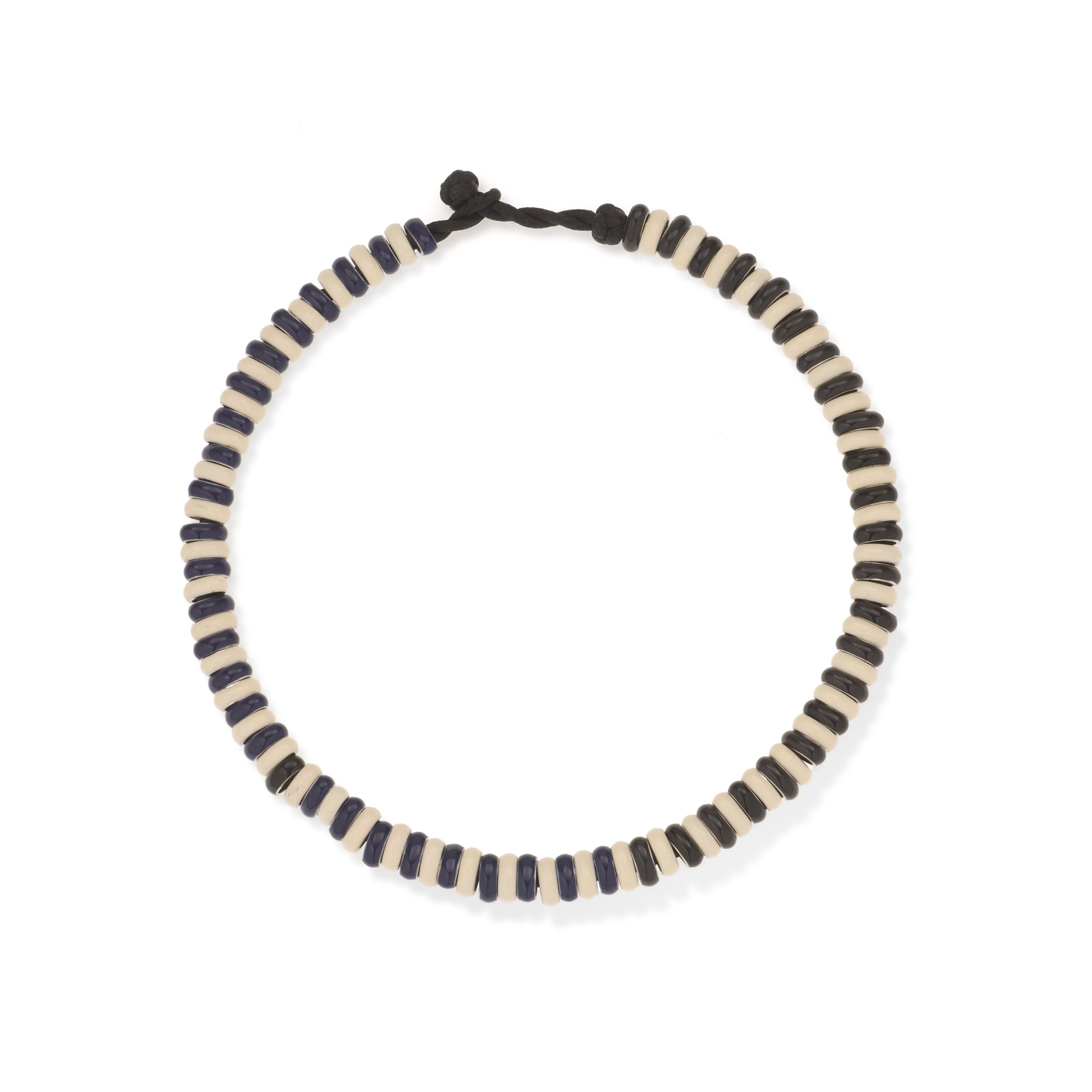 A playful nod to pattern, the Midnight Stripe Enamel Mini Bead Anklet features black, white, and navy enamel-wrapped sterling silver beads strung on a black satin cord. Inspired by stripes in the wild—from classic tennis match awnings to bold runway moments—this anklet adds a fresh, graphic element to your everyday. For a matching moment, pair it with the Midnight Stripe Full Enamel Necklace.