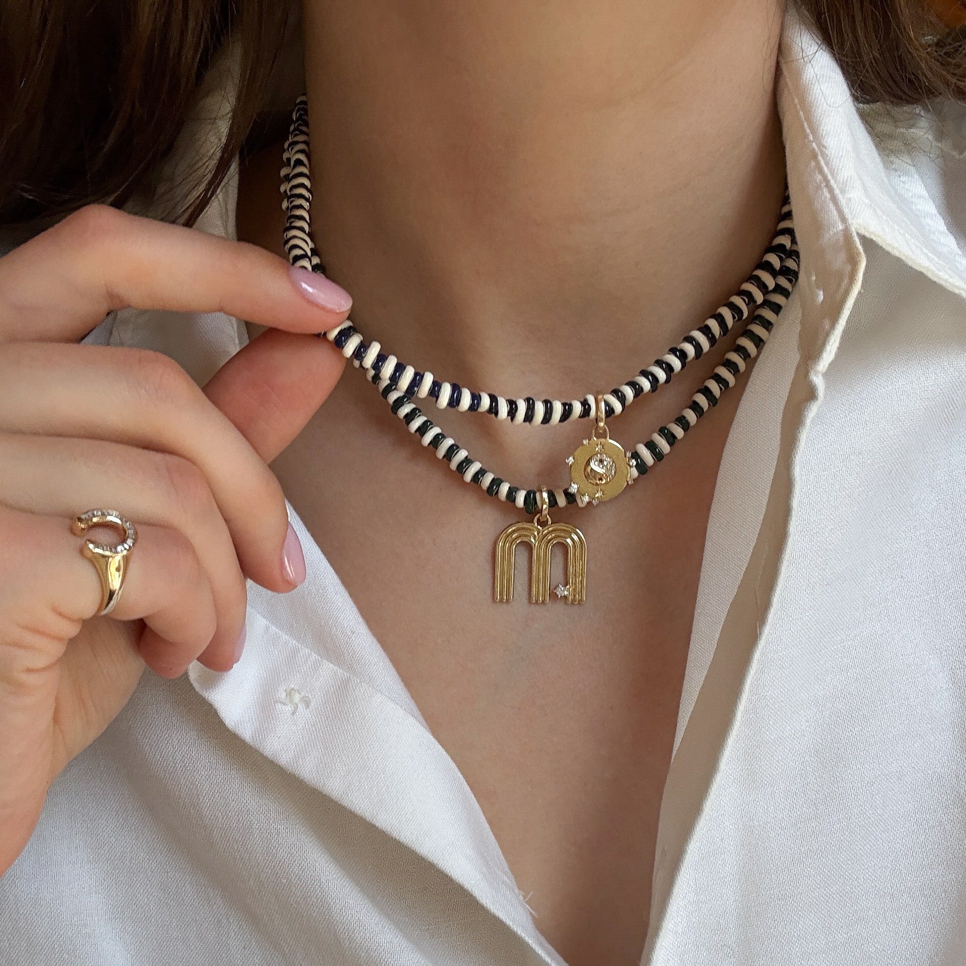 A new essential for your warm-weather wardrobe. The Midnight Stripes Full Enamel Mini Bead Necklace features enamel-wrapped sterling silver beads in black, white, and navy—each one strung on black satin cord for a crisp, modern finish. Inspired by stripe moments everywhere—from coastal escapes to city streets—it’s a fresh foundation for your favorite charms. We especially love it with a Groovy Initial Hinged Charm clipped at center.