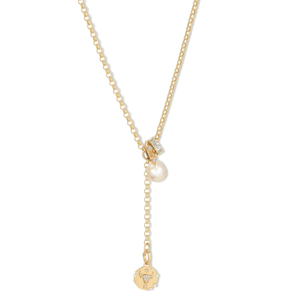 Introducing our Written in the Stars Lariat featuring our luminous Pearl Drop Charm, Diamond Baguette Big Bead and bestselling Pavé 8 Spike Big Bead, handcrafted in solid 14k yellow gold with diamonds. Strung on our Rolo Y-chain, each link is masterfully hand-forged by skilled artisans for a lightweight, effortless feel. This meaningful lariat is finished with your choice of Zodiac Hinged Charm.