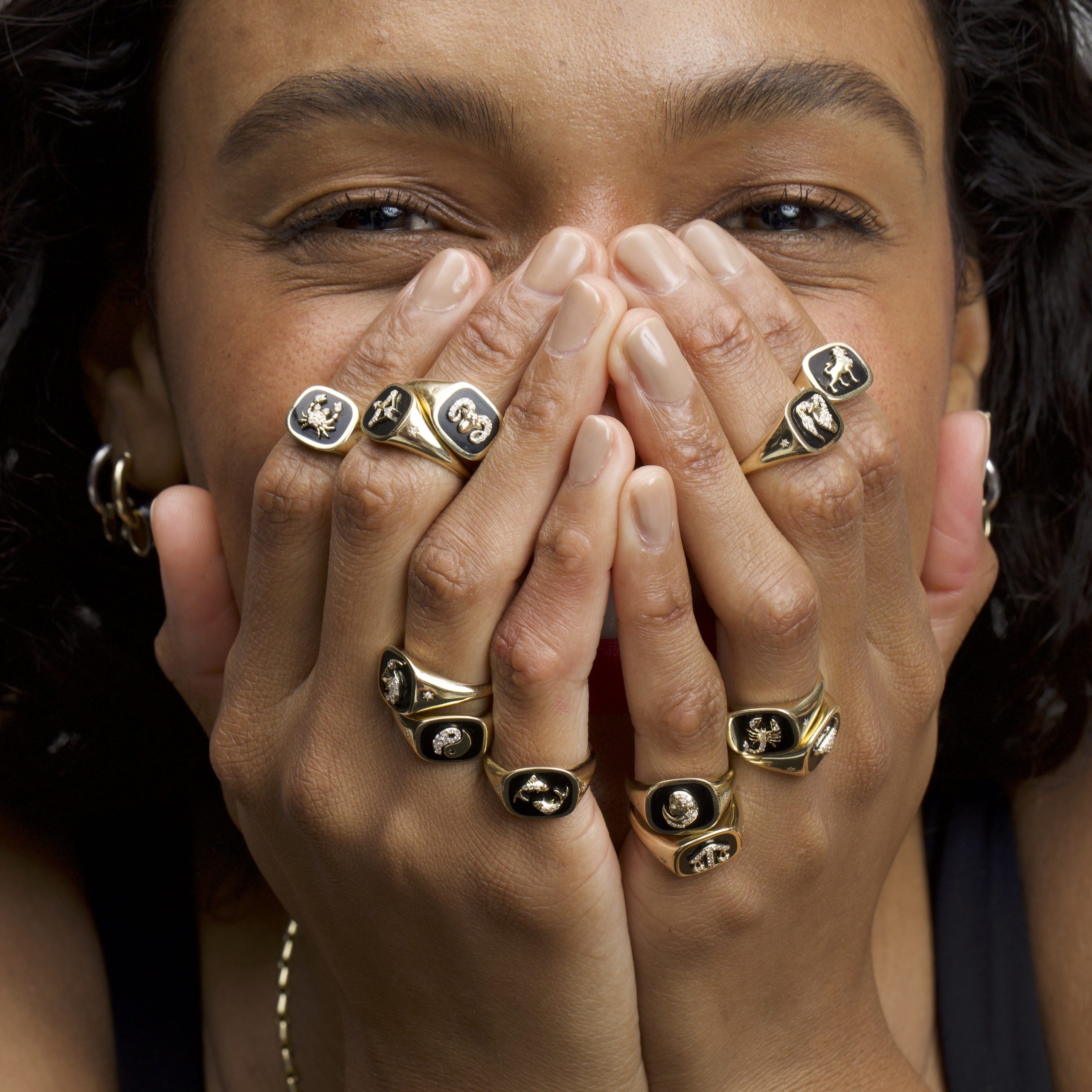 14k yellow gold and black ceramic signet ring with the Gemini symbol, embellished with hand-set pavé diamonds.